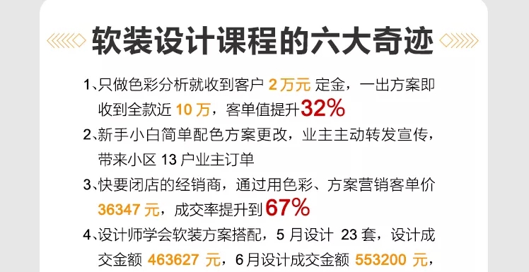 導讀: 軟裝設計課程的六大奇跡1、只做色彩分析就收到客戶2萬元定金,一出方案即收到全款近10萬,客單值提升32%。2、新手小白簡單配色方案更改,業主主動轉發宣傳,帶來小區13戶業主訂單。3、快要閉店的經銷商,通過用色彩、方案營銷客單價36347元,成交率提升到67%。